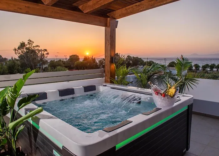 The beachfront 1-bedroom Odyssea Top View & Hot Jacuzzi Front Beach Apartment Kremasti includes a terrace and is located approximately 10 minutes by car from Church of Our Lady of Filerimos. Along with a private beach area this spacious apartment also has sea vistas.